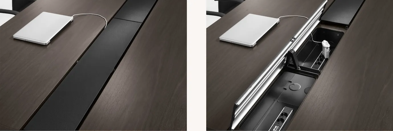 - Integrierte Medientechnik: Diskrete Medienklappen und Kabelwannen sichern eine kaum sichtbare Organisation der Kabel.