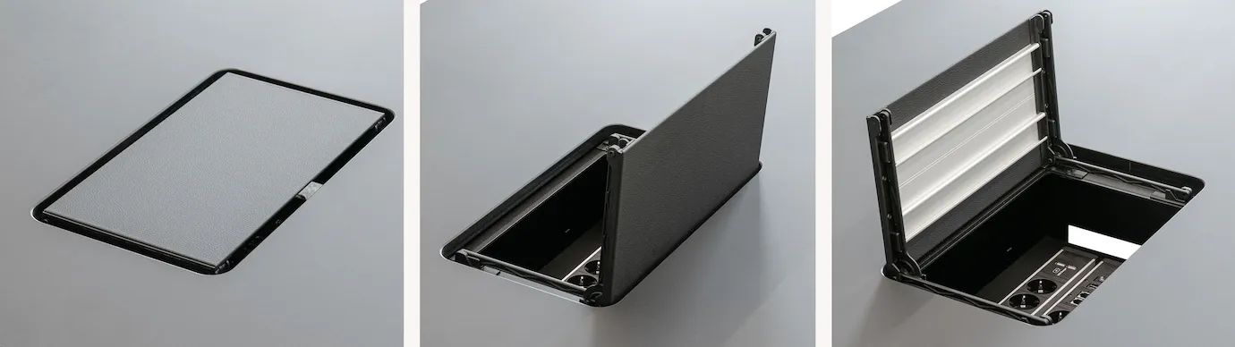 - Intelligente Medienintegration: Nutzen Sie die beidseitig öffnende Dualklappe aus Aluminium für einen direkten und sauberen Zugriff auf Strom und Netzwerk.