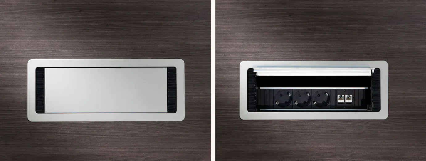 - Integrierte Medientechnik: Clevere Optionen wie wählbare Plugboxen und eine Kabelwanne garantieren eine stets aufgeräumte Arbeitsfläche.