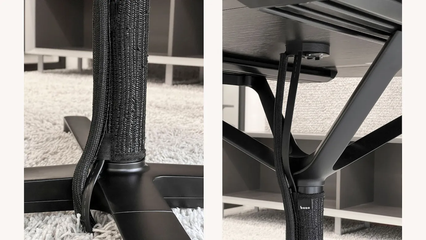 - Diskrete Kabelführung: Ein flexibler Strickgewebeschlauch an der Säule leitet alle Leitungen sicher zum Bodenanschluss.