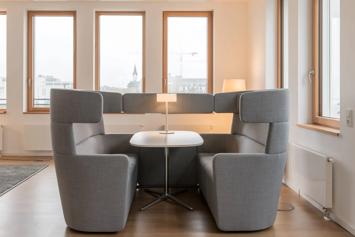 Die von Pearson Lloyd entworfene Serie nutzt die Form traditioneller Ohrensessel, um eine schützende Hülle für die Nutzer zu bilden. In der hohen Variante mit einer Höhe von 1288 mm bieten die Seitenkopfstützen eine exzellente akustische und visuelle Abschirmung. Dies ist besonders in unruhigen Großraumbüros wertvoll, da es konzentrierte Gespräche und fokussiertes Arbeiten ermöglicht. Für Umgebungen, in denen ein gewisser Grad an Offenheit gewünscht ist, bietet die mittelhohe Ausführung mit 936 mm die perfekte Balance zwischen Rückzug und Einbindung in den Raum. Durch die gegenüberliegende Anordnung von zwei Bene PARCS Wing Sofas entsteht einRaum-in-Raum-Element, das sich ideal für kleine Teams mit 4 bis 6 Personen eignet.