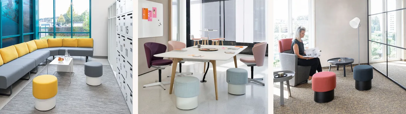 Bene PARCS Pop-Up Stool mit einer Vielfalt an Stoffbezügen für den flexiblen Einsatz im Open Office