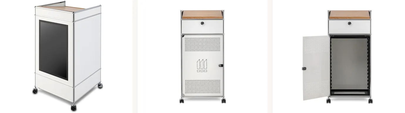Das infoWERK FR50 Stehpult ist die optimale Lösung für alle, die keine Kompromisse zwischen Design und Funktionalität eingehen wollen. Durch die Integration des 19-Zoll-Medienracks in das bewährte USM Haller Untergestell erhalten Sie ein Stehpult, das Ihre Konferenztechnik sicher schützt und gleichzeitig Ihre Professionalität unterstreicht. Dank der zahlreichen Konfigurationsmöglichkeiten gestalten Sie das FR50 Stehpult ganz nach Ihren Vorstellungen und Ansprüchen.
