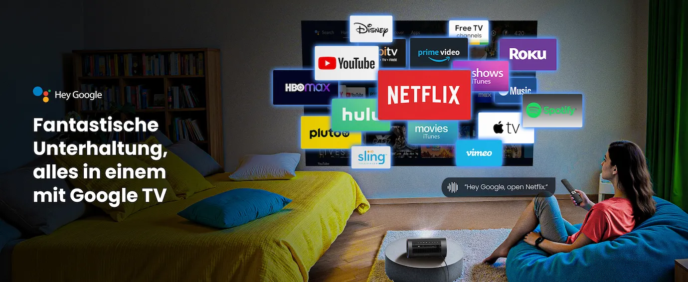 Mit dem JMGO PicoPlay+ holen Sie sich ein vollwertiges Smart-TV-Erlebnis in die eigenen vier Wände. Das installierte Google TV 3.0 System ermöglicht eine intuitive Bedienung und bietet schnellen Zugriff auf über tausend Apps, wobei Netflix bereits nativ integriert ist. Die Bedienung wird durch den integrierten Google Assistant und die Chromecast-Funktion zusätzlich erleichtert, sodass Sie Inhalte direkt von Ihrem Smartphone spiegeln können. Für die passende akustische Untermalung sorgt der verbaute 8 Watt Lautsprecher mit Dolby Audio Unterstützung, der einen klaren und raumfüllenden Klang erzeugt. In kleinen bis mittelgroßen Räumen benötigen Sie somit keine externen Audiosysteme, um Filme in angemessener Qualität zu genießen. Diese Kombination aus smarter Software und leistungsstarker Hardware macht den Projektor zum idealen Partner für spontane Filmabende oder Präsentationen im Home-Office.