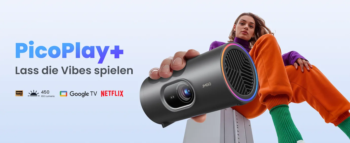 Wir bei visunext empfehlen den JMGO PicoPlay+, wenn Sie eine wirklich mobile Lösung suchen, die keine Kompromisse bei der Softwarequalität eingeht. Während viele kompakte Projektoren oft an fehlenden Lizenzen für Streaming-Dienste scheitern, bietet dieser tragbare Full HD Beamer mit integriertem Google TV und nativem Netflix direkten Zugriff auf Ihre Lieblingsinhalte. Die innovative Bauweise mit einem verstellbaren Winkel von bis zu 127 Grad löst das Problem starrer Aufbauten und ermöglicht Ihnen eine Projektion an nahezu jede Fläche, sogar an die Zimmerdecke. Starten Sie jetzt Ihr persönliches Kinoerlebnis an jedem Ort.