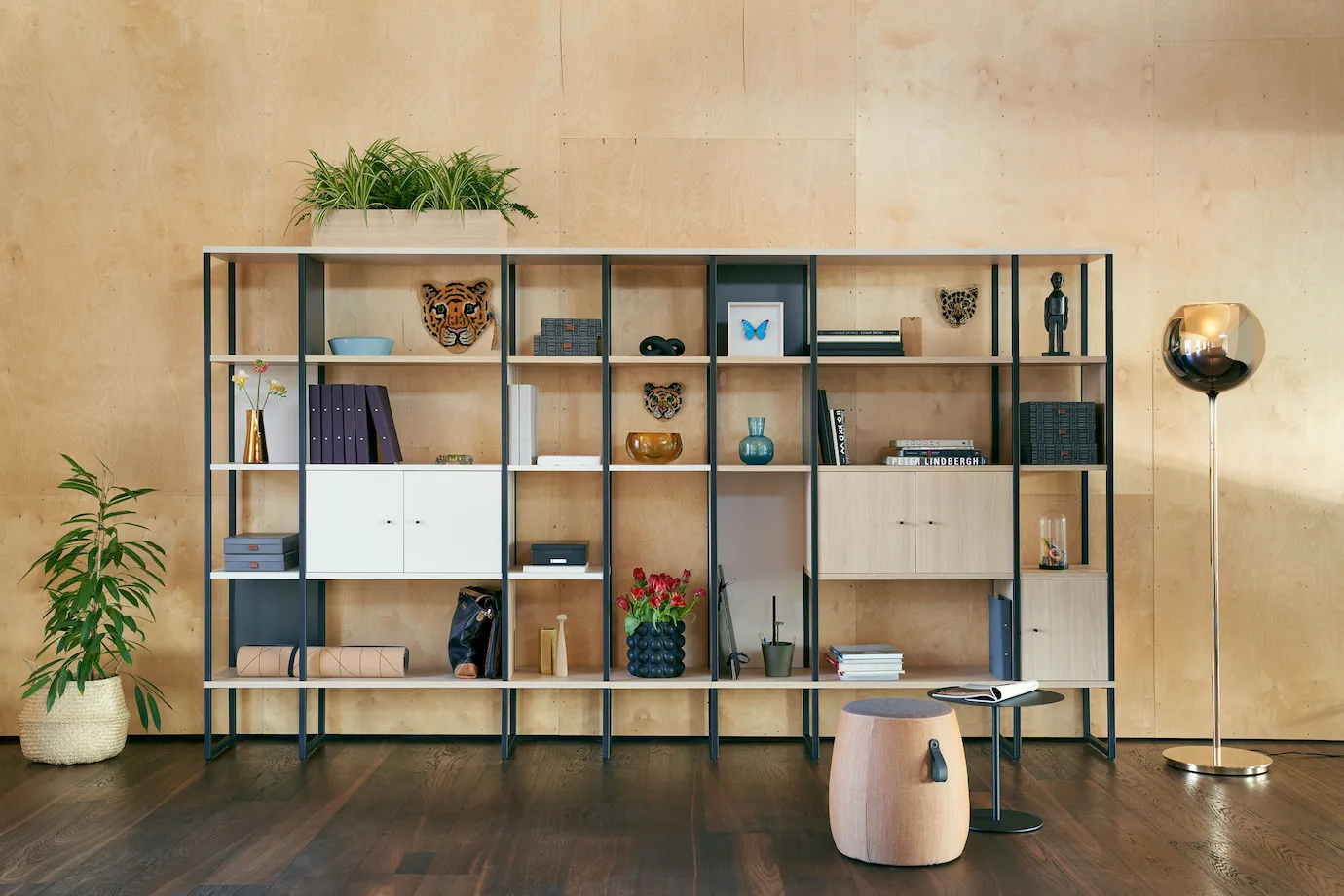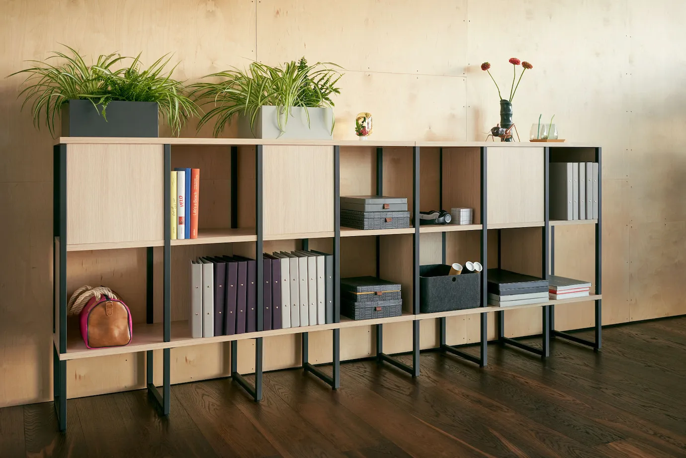 Das se:matrix Regalmodul light basiert auf einer langlebigen Stahlrahmenkonstruktion, die trotz der filigranen Optik hohe Stabilität gewährleistet. Die Einlegeböden bestehen aus widerstandsfähigem Melamin und sind für die tägliche Belastung im Büroalltag ausgelegt. Ergänzt wird das System durch Stellgleiter an den Kufen, die einen festen Stand sichern. Das Rastermaß bietet Platz für Ordner und Boxen. Zudem lassen sich Elemente aus PET-Filz integrieren, um Fächer visuell zu schließen und die Raumakustik zu verbessern.