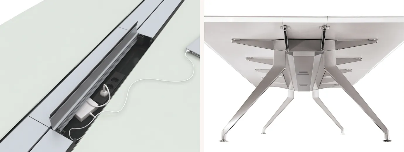 Ein zentraler, großvolumiger Kabelkanal unter einer Klappabdeckung ermöglicht den unkomplizierten Zugang zu Strom- und Datenverbindungen aus nahezu jeder Sitzposition. Dadurch bleibt die Tischoberfläche des 4.8 four point eight stets aufgeräumt und sauber, wodurch die Konzentration im Meeting gefördert und die visuelle Ästhetik des Raumes gewahrt wird. Ergänzbare Brücken über dem Kabelkanal schaffen zusätzliche Ablageflächen und helfen Ihnen, die Ordnung auf der Tischplatte zu halten.