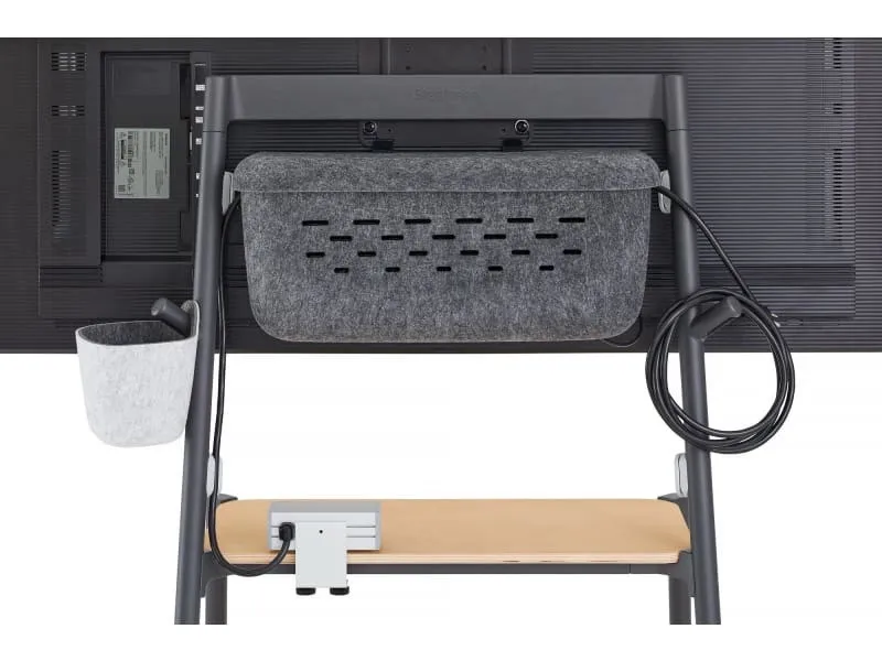 Die optionale Konfiguration des Media Baskets ergänzt die bereits vorhandene Stromversorgung durch drei weitere Stromanschlüsse im Media Basket selbst. Alle Kabel können ordentlich und unsichtbar ebenfalls darin untergebracht werden. Dies beseitigt nicht nur Stolperfallen, sondern schafft auch eine aufgeräumte und professionelle Präsentationsumgebung. Auch ohne den Media Basket ist die Grundfunktion der Kabelsicherung am Wagen gewährleistet. Der Steelcase Flex Media Wagen verfügt standardmäßig über eingebaute Haken am Rahmen. Diese Haken sind Teil des grundlegenden Kabelmanagements des Wagens und ermöglichen es, das Netzkabel und auch andere Displaykabel bei Nichtgebrauch ordentlich aufzurollen und zu befestigen. Dadurch wird verhindert, dass das Kabel lose auf dem Boden liegt und eine Stolperfalle darstellt.