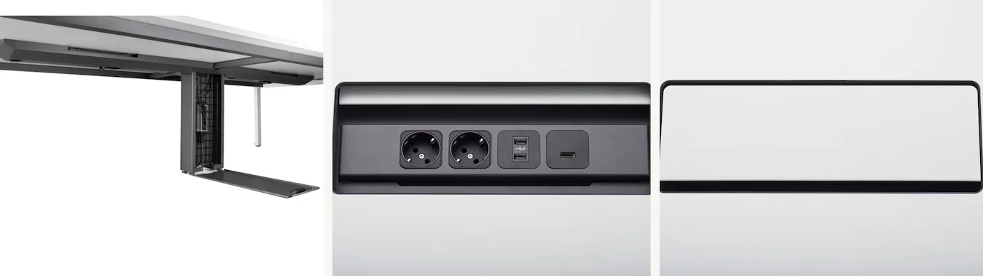 Gerade in formellen und technikintensiven Meetings ist eine zuverlässige Konnektivität entscheidend. Die rechteckigen Konferenztische können optional mit einem oder zwei Kabeleinlässen konfiguriert werden, die über die Steckdosen und Anschlüsse direkt am Tisch erreichbar sind. Dies ermöglicht eine aufgeräumte und strukturierte Arbeitsfläche, da störende Kabel ordentlich geführt werden. Die integrierte Stromversorgung gewährleistet, dass Laptops und Präsentationsgeräte jederzeit problemlos verbunden werden können.