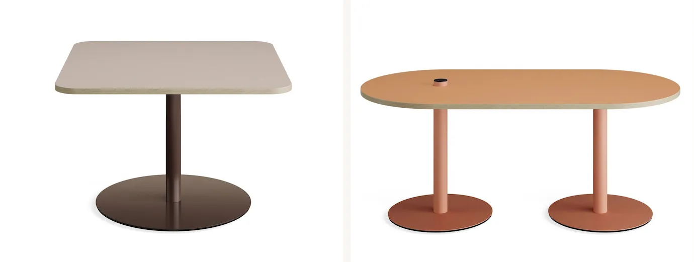 - Vielfältige Gestaltung: Wählen Sie aus runden, quadratischen, länglich-ovalen oder rechteckigen Tischplatten und hochwertigen Oberflächen wie Linoleum oder nachhaltigem WYE Neolign.