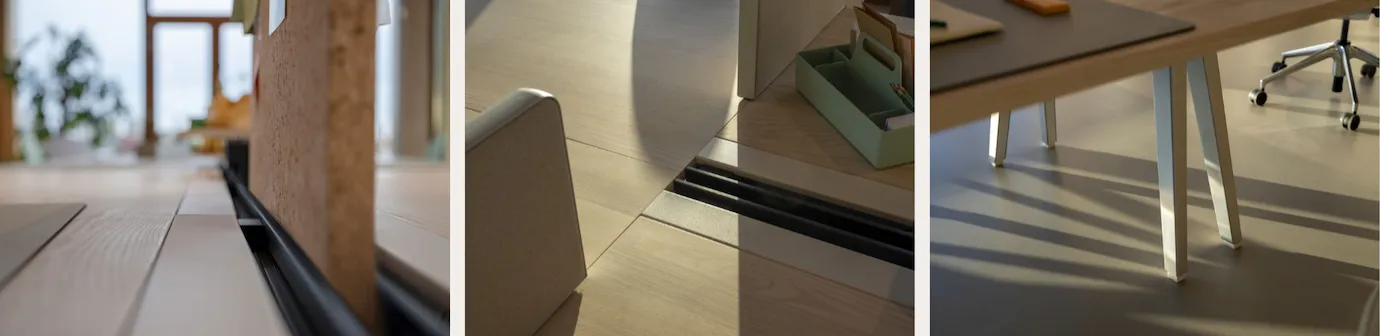 - Organisiertes Zubehör: Integrieren Sie Trennwände und Organisations-Tools direkt an der Technikschiene oder im Tischspalt, um persönliche Bereiche individuell zu gestalten.