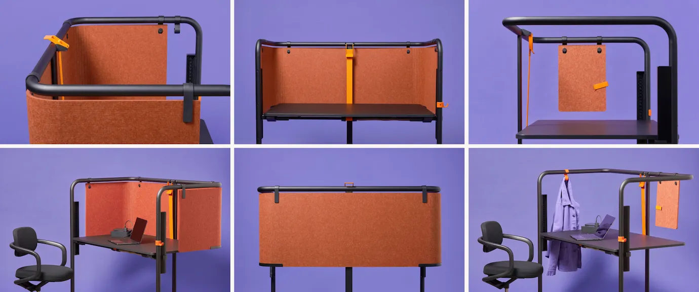 - Markanter Stahlrohrrahmen: Robuste Konstruktion, welche den privaten Arbeitsplatz definiert und durch funktionale Accessoires wie Halterungen oder Screens zum Sichtschutz erweitert werden kann.