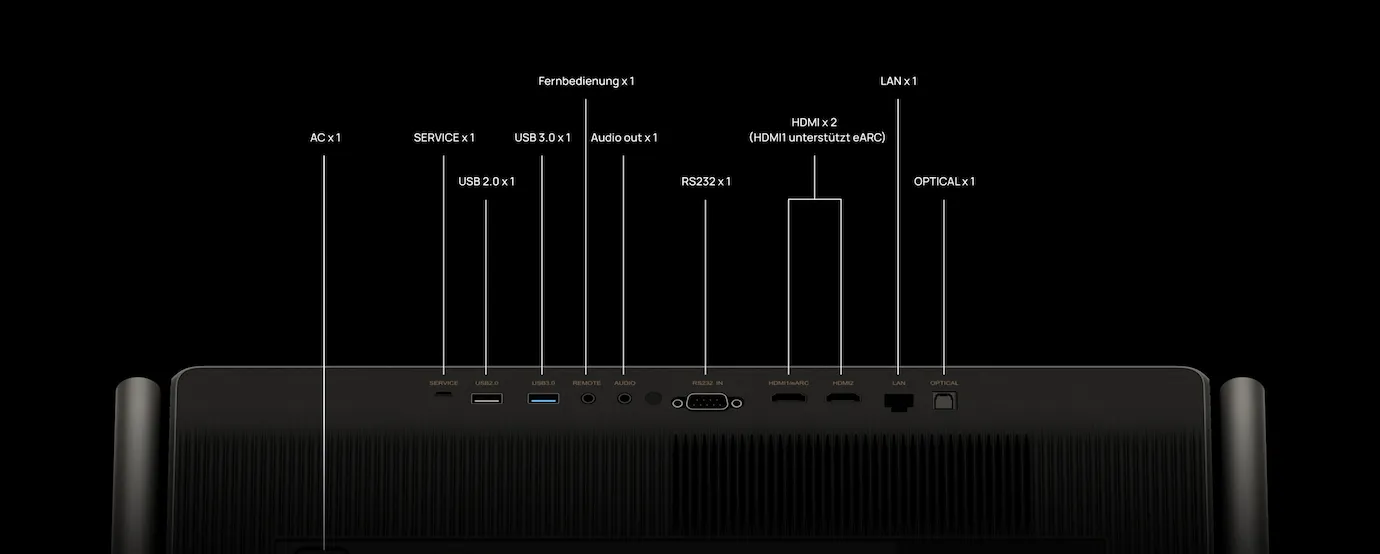 Der XGIMI TITAN lässt sich nahtlos in jede Systemumgebung integrieren. Für Ihre hochauflösenden Zuspieler, wie 4K-Blu-ray-Player oder Spielkonsolen, stehen zwei HDMI-Anschlüsse bereit, wobei einer eARC für die unkomplizierte Anbindung einer Soundbar oder eines AV-Receivers unterstützt. Eine stabile Netzwerkverbindung wird durch den LAN-Anschluss und modernes WiFi 6 sichergestellt. Für externe Medien oder Peripheriegeräte stehen sowohl USB 3.0 als auch USB 2.0 zur Verfügung. Flexible Audio-Optionen bieten der optische Ausgang und der separate Audio-Ausgang. Zusätzlich ermöglicht der RS232-Anschluss die Einbindung in professionelle Steuerungs-Systeme, was den TITAN auch für anspruchsvolle Smart-Home-Installationen ideal macht.